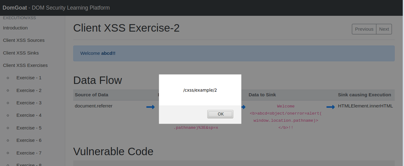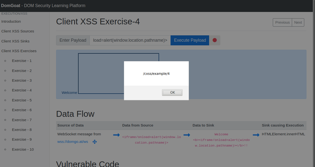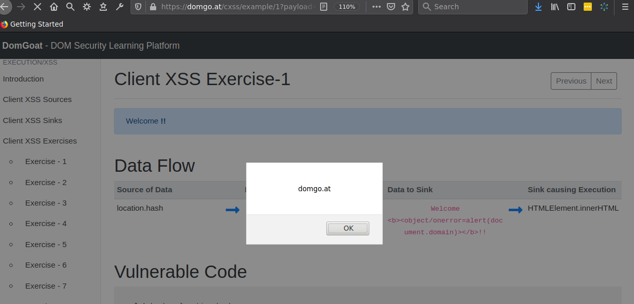 The same payload from Exercise 1 can be used. Here Exercise 1 page is first visited.