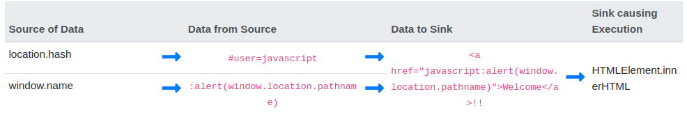 - Sinks that execute payload as HTML - innerHTML, outerHTML, document.write, document.writeln