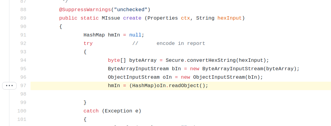 This method is used by IssueReportServlet which takes a user parameter called ISSUE can contain serialized data within ASCII hex encoding.