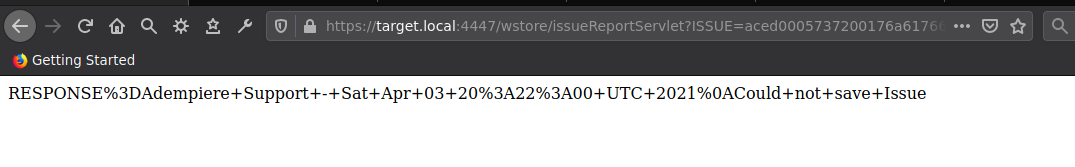 https://target.local:4447/wstore/issueReportServlet?ISSUE=aced0005737200176a6176612e7574696c2e5072696f72697479517565756594da30b4fb3f82b103000249000473697a654c000a636f6d70617261746f727400164c6a6176612f7574696c2f436f6d70617261746f723b7870000000027372002b6f72672e6170616368652e636f6d6d6f6e732e6265616e7574696c732e4265616e436f6d70617261746f72e3a188ea7322a4480200024c000a636f6d70617261746f7271007e00014c000870726f70657274797400124c6a6176612f6c616e672f537472696e673b78707372003f6f72672e6170616368652e636f6d6d6f6e732e636f6c6c656374696f6e732e636f6d70617261746f72732e436f6d70617261626c65436f6d70617261746f72fbf49925b86eb13702000078707400106f757470757450726f706572746965737704000000037372003a636f6d2e73756e2e6f72672e6170616368652e78616c616e2e696e7465726e616c2e78736c74632e747261782e54656d706c61746573496d706c09574fc16eacab3303000649000d5f696e64656e744e756d62657249000e5f7472616e736c6574496e6465785b000a5f62797465636f6465737400035b5b425b00065f636c6173737400125b4c6a6176612f6c616e672f436c6173733b4c00055f6e616d6571007e00044c00115f6f757470757450726f706572746965737400164c6a6176612f7574696c2f50726f706572746965733b787000000000ffffffff757200035b5b424bfd19156767db37020000787000000002757200025b42acf317f8060854e00200007870000006a7cafebabe0000003200390a0003002207003707002507002601001073657269616c56657273696f6e5549440100014a01000d436f6e7374616e7456616c756505ad2093f391ddef3e0100063c696e69743e010003282956010004436f646501000f4c696e654e756d6265725461626c650100124c6f63616c5661726961626c655461626c6501000474686973010013537475625472616e736c65745061796c6f616401000c496e6e6572436c61737365730100354c79736f73657269616c2f7061796c6f6164732f7574696c2f4761646765747324537475625472616e736c65745061796c6f61643b0100097472616e73666f726d010072284c636f6d2f73756e2f6f72672f6170616368652f78616c616e2f696e7465726e616c2f78736c74632f444f4d3b5b4c636f6d2f73756e2f6f72672f6170616368652f786d6c2f696e7465726e616c2f73657269616c697a65722f53657269616c697a6174696f6e48616e646c65723b2956010008646f63756d656e7401002d4c636f6d2f73756e2f6f72672f6170616368652f78616c616e2f696e7465726e616c2f78736c74632f444f4d3b01000868616e646c6572730100425b4c636f6d2f73756e2f6f72672f6170616368652f786d6c2f696e7465726e616c2f73657269616c697a65722f53657269616c697a6174696f6e48616e646c65723b01000a457863657074696f6e730700270100a6284c636f6d2f73756e2f6f72672f6170616368652f78616c616e2f696e7465726e616c2f78736c74632f444f4d3b4c636f6d2f73756e2f6f72672f6170616368652f786d6c2f696e7465726e616c2f64746d2f44544d417869734974657261746f723b4c636f6d2f73756e2f6f72672f6170616368652f786d6c2f696e7465726e616c2f73657269616c697a65722f53657269616c697a6174696f6e48616e646c65723b29560100086974657261746f720100354c636f6d2f73756e2f6f72672f6170616368652f786d6c2f696e7465726e616c2f64746d2f44544d417869734974657261746f723b01000768616e646c65720100414c636f6d2f73756e2f6f72672f6170616368652f786d6c2f696e7465726e616c2f73657269616c697a65722f53657269616c697a6174696f6e48616e646c65723b01000a536f7572636546696c6501000c476164676574732e6a6176610c000a000b07002801003379736f73657269616c2f7061796c6f6164732f7574696c2f4761646765747324537475625472616e736c65745061796c6f6164010040636f6d2f73756e2f6f72672f6170616368652f78616c616e2f696e7465726e616c2f78736c74632f72756e74696d652f41627374726163745472616e736c65740100146a6176612f696f2f53657269616c697a61626c65010039636f6d2f73756e2f6f72672f6170616368652f78616c616e2f696e7465726e616c2f78736c74632f5472616e736c6574457863657074696f6e01001f79736f73657269616c2f7061796c6f6164732f7574696c2f476164676574730100083c636c696e69743e0100116a6176612f6c616e672f52756e74696d6507002a01000a67657452756e74696d6501001528294c6a6176612f6c616e672f52756e74696d653b0c002c002d0a002b002e010013746f756368202f746d702f746573742e74787408003001000465786563010027284c6a6176612f6c616e672f537472696e673b294c6a6176612f6c616e672f50726f636573733b0c003200330a002b003401000d537461636b4d61705461626c6501001d79736f73657269616c2f50776e6572333333303639363733373339363601001f4c79736f73657269616c2f50776e657233333330363936373337333936363b002100020003000100040001001a000500060001000700000002000800040001000a000b0001000c0000002f00010001000000052ab70001b100000002000d0000000600010000002f000e0000000c000100000005000f003800000001001300140002000c0000003f0000000300000001b100000002000d00000006000100000034000e00000020000300000001000f0038000000000001001500160001000000010017001800020019000000040001001a00010013001b0002000c000000490000000400000001b100000002000d00000006000100000038000e0000002a000400000001000f003800000000000100150016000100000001001c001d000200000001001e001f00030019000000040001001a00080029000b0001000c00000024000300020000000fa70003014cb8002f1231b6003557b1000000010036000000030001030002002000000002002100110000000a000100020023001000097571007e0010000001d4cafebabe00000032001b0a0003001507001707001807001901001073657269616c56657273696f6e5549440100014a01000d436f6e7374616e7456616c75650571e669ee3c6d47180100063c696e69743e010003282956010004436f646501000f4c696e654e756d6265725461626c650100124c6f63616c5661726961626c655461626c6501000474686973010003466f6f01000c496e6e6572436c61737365730100254c79736f73657269616c2f7061796c6f6164732f7574696c2f4761646765747324466f6f3b01000a536f7572636546696c6501000c476164676574732e6a6176610c000a000b07001a01002379736f73657269616c2f7061796c6f6164732f7574696c2f4761646765747324466f6f0100106a6176612f6c616e672f4f626a6563740100146a6176612f696f2f53657269616c697a61626c6501001f79736f73657269616c2f7061796c6f6164732f7574696c2f47616467657473002100020003000100040001001a000500060001000700000002000800010001000a000b0001000c0000002f00010001000000052ab70001b100000002000d0000000600010000003c000e0000000c000100000005000f001200000002001300000002001400110000000a000100020016001000097074000450776e72707701007871007e000d78