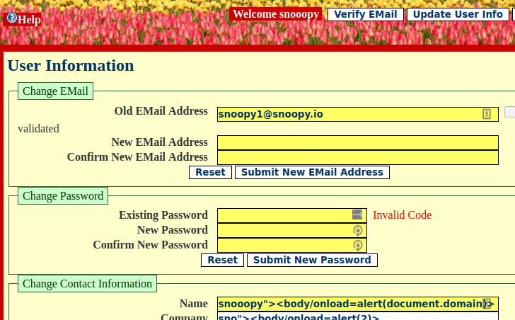 It is possible to inject malicious JavaScript into the name parameter of a user profile.