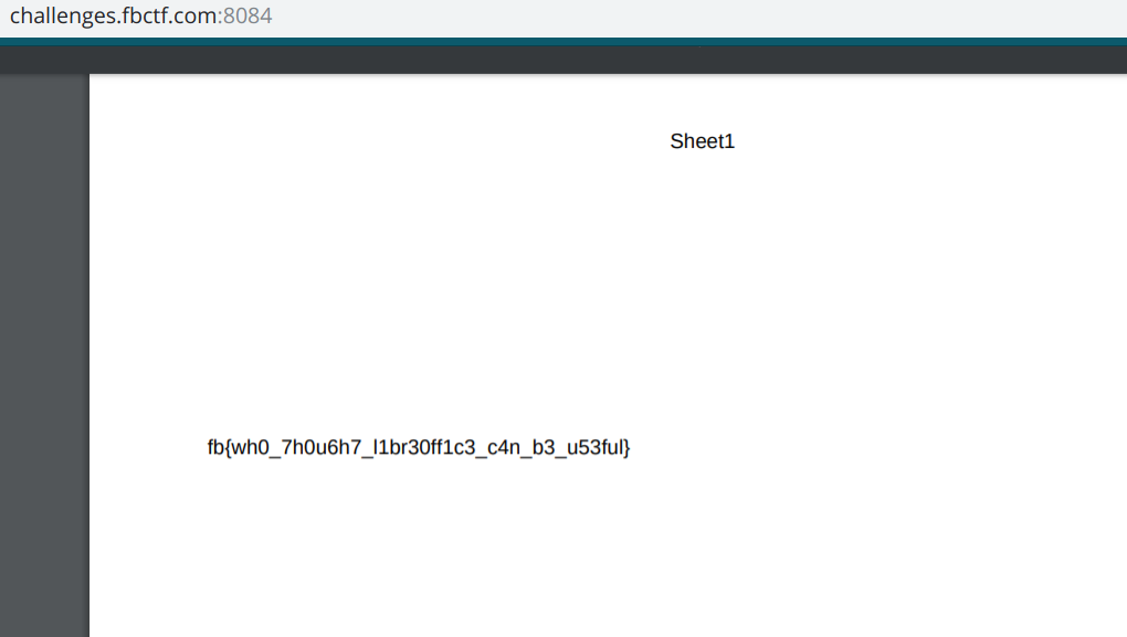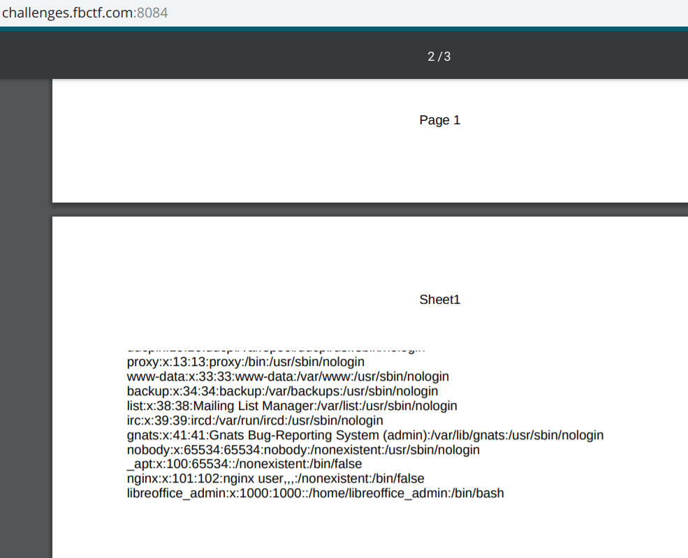 Retrieval of the passwd file tells us that the home directory of the libreoffice_admin user is /home/libreoffice_admin. After multiple attempts, the flag was found to be within the follow directory path: home/libreoffice_admin/flag