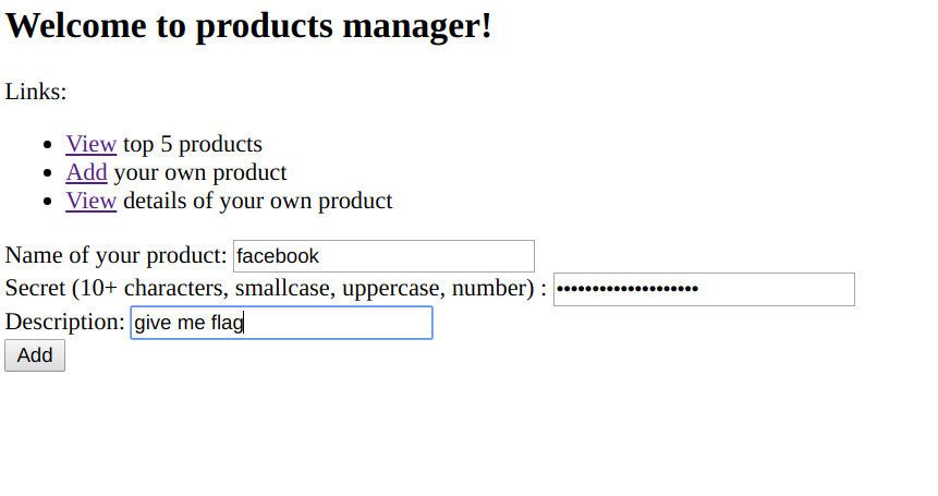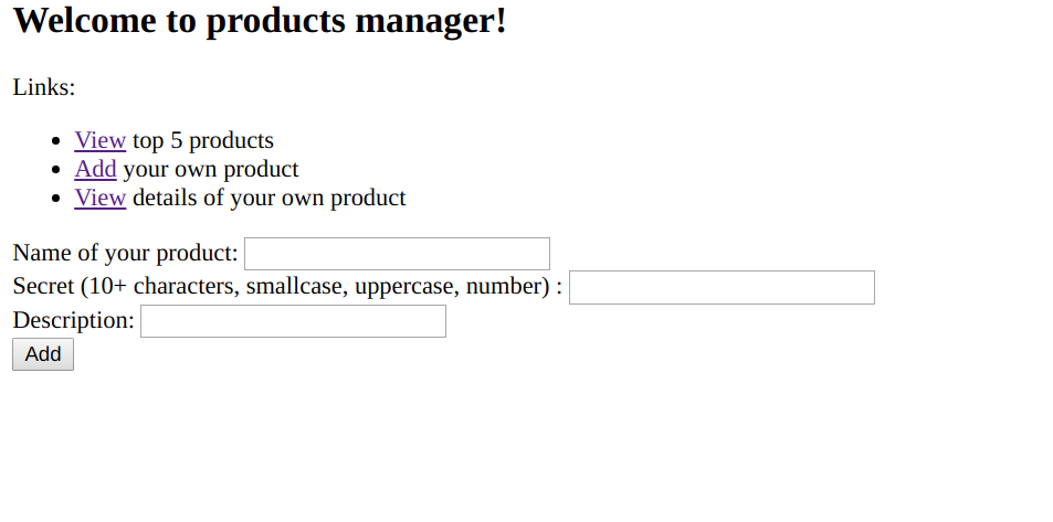 To add a product, a secret needs to be created. After a product is added, this can be viewed and by submitting the product name and the secret. The source code the application is also provided for the challenge.