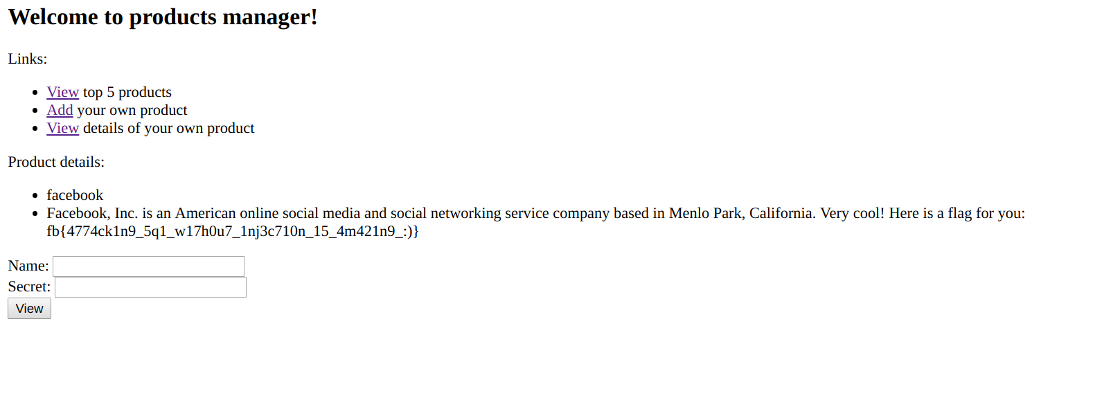 Tracing the code to where it is being called (see below), the following can be deduced.The check_name_secret function checks if a product exists with the entered name and secret value. However, the get_product function only returns one row from the database by using the name parameter. As such, you could add another product called facebook with a secret and get the application program to return the first already creadted product found with the name facebook.