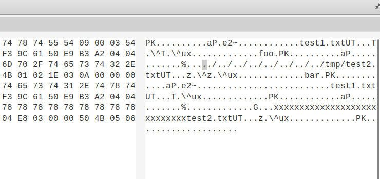 This ZIP can then be opened using a HEX editor and the test2 filename can be edited to be something such as ../../../../../../../../tmp/test2.txt.