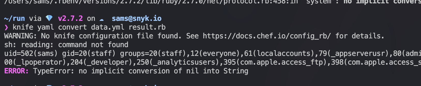 So one can provide the command knife yaml convert data.yml results.rb with the data.yml being the below dangerous code (deserialization gadget for ruby 2.x, tested on knife 17.10.0)