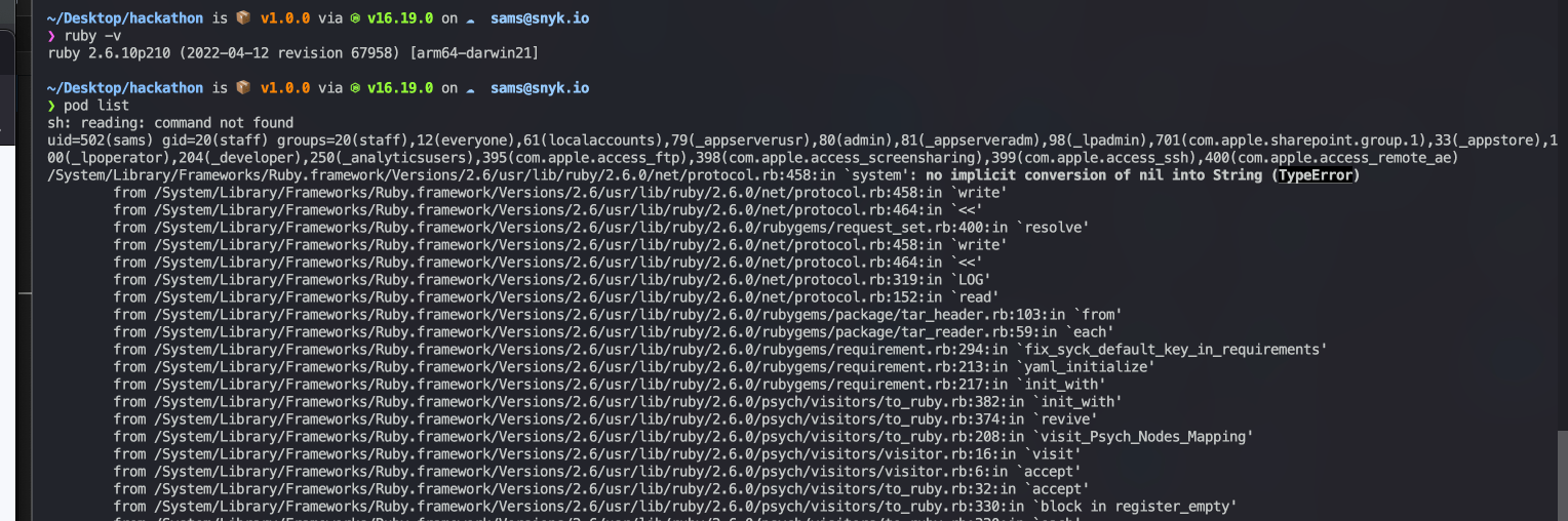 If I can overwrite ~/.cocoapods/config.yaml with the below deserialization gadget, which executes the id command, i can leverage cocoapods for code execution