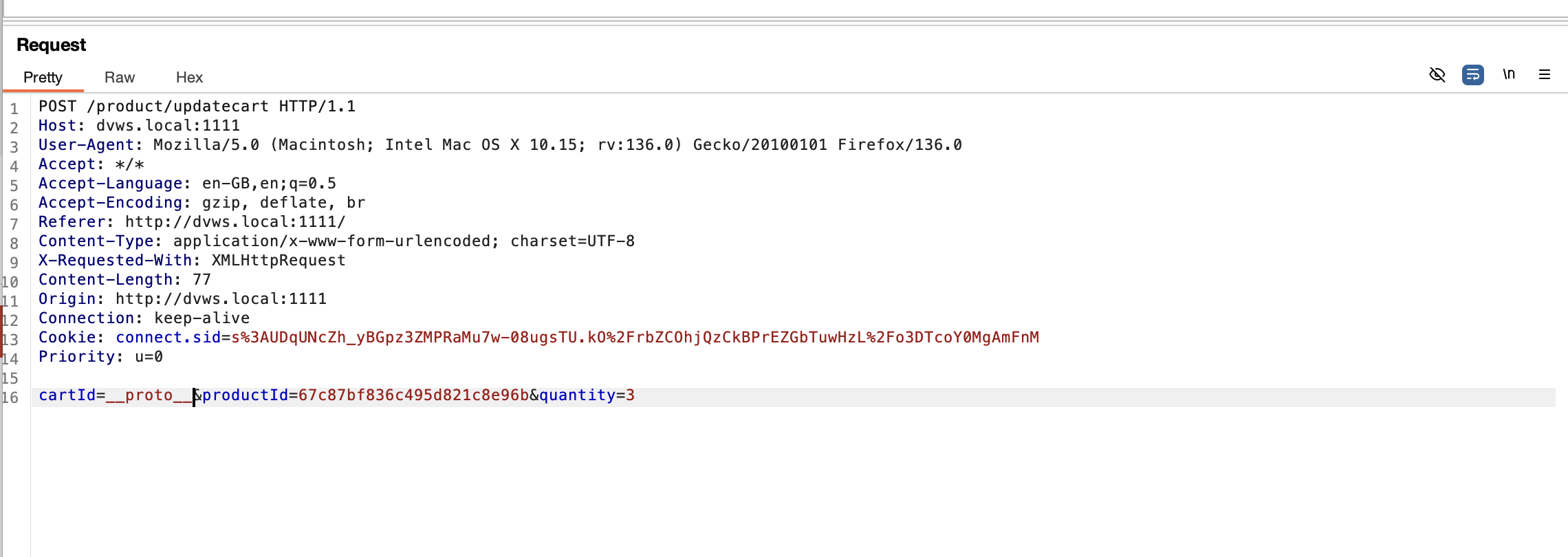 This then becomes part of req.session.cart[productCartId] e.g. req.session.cart[__proto__] (the code that is highlighted here - https://github.com/snoopysecurity/expressCart/blob/master/routes/index.js#L803)