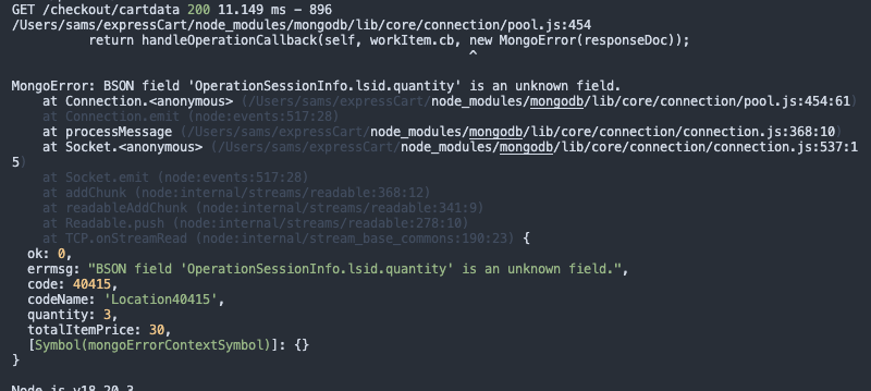 This then traverses the prototype chain and adds quantity, totalItemPrice to all objects in the prototype chain. This then crashes the application because qualitity is added as a field to a mongodb connection call which creates a mongodb error which then crashes the application.