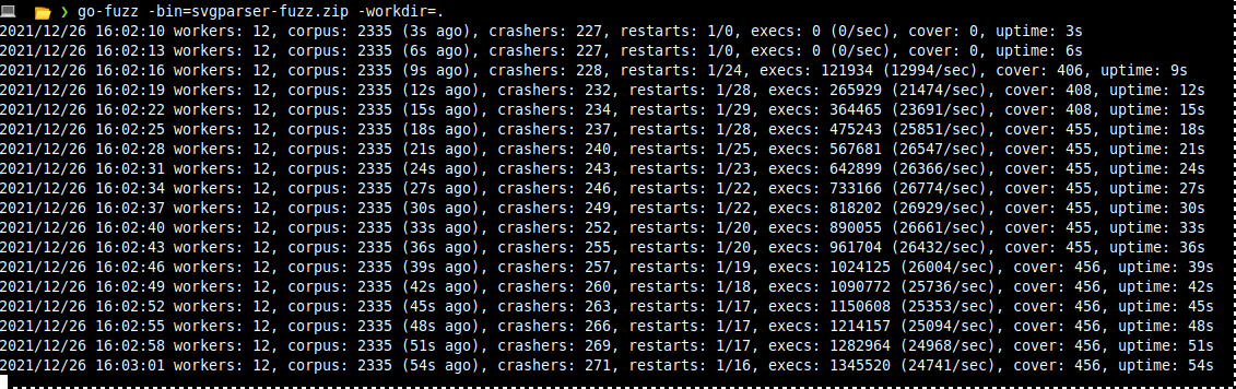 going back to your working directory, you can now start gofuzz: go-fuzz -bin=svgparser-fuzz.zip -workdir=. The working directory here should contain a folder corpus with all the svg files your previous found.