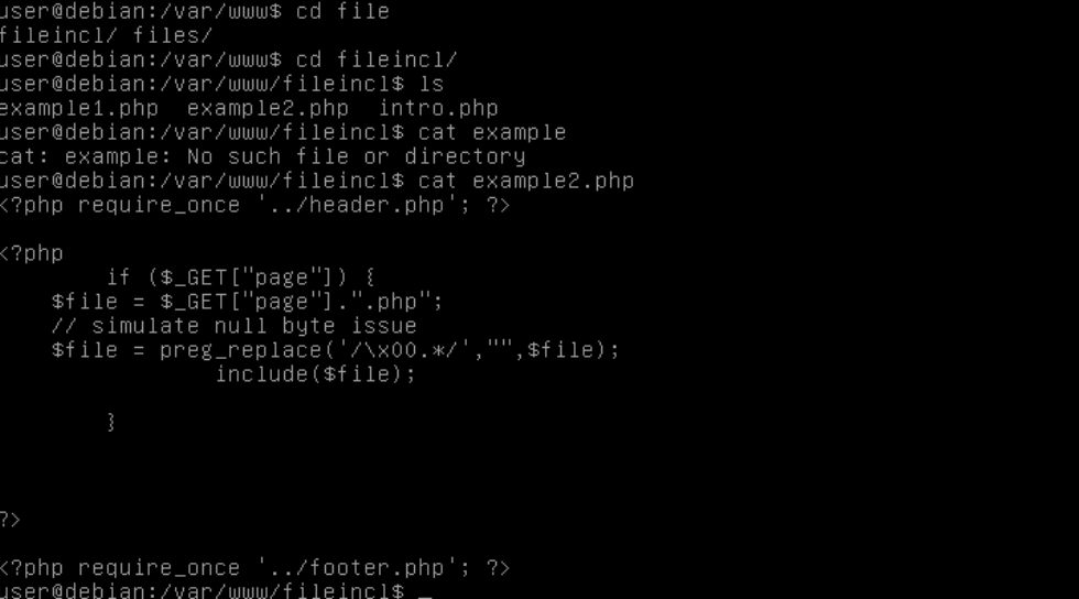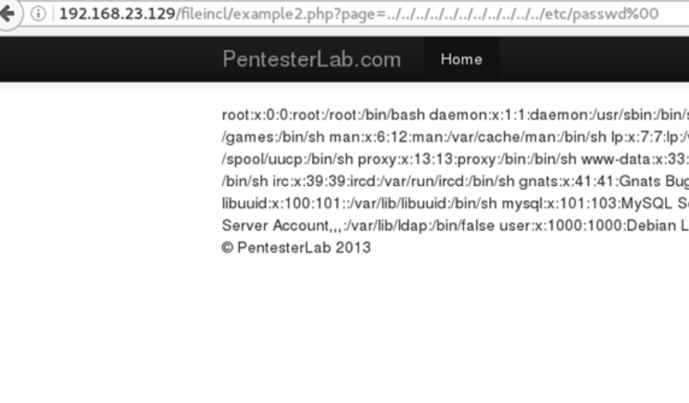 An attacker can exploit this vulnerability by injecting directory traversal characters and look for local system files such as /etc/passwd or C:\Windows\win.ini. It should be noted that the example does check if the given input has a .php extension. This can be bypassed by an attacker using the null byte terminator. In many systems, null bytes are processed as string termination; thus the file extension check can be bypassed by adding %00 at the end of a user input.