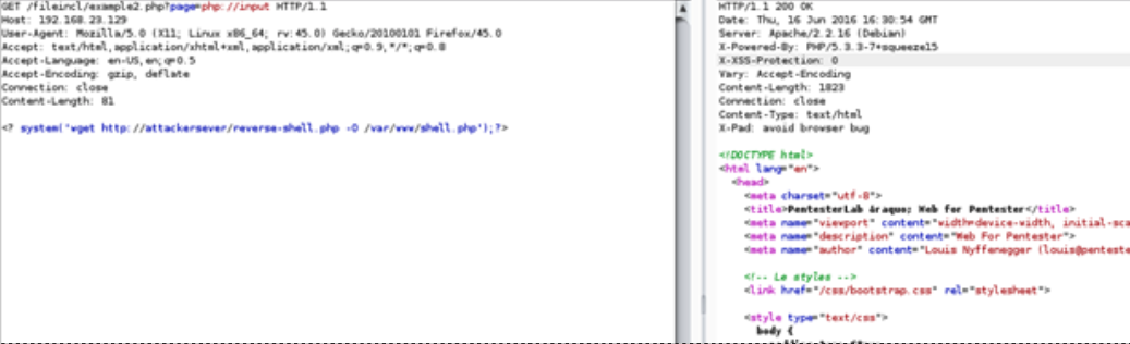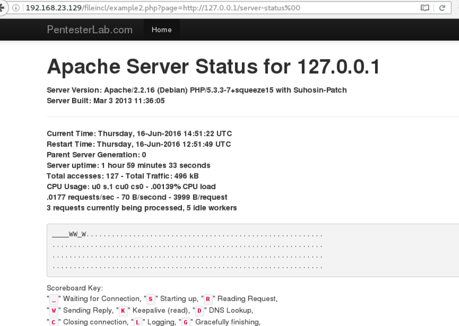 The Apache server status file can be retrieved by using the http:// URI. To gain a remote shell on the server, the php://input wrapper can be used.