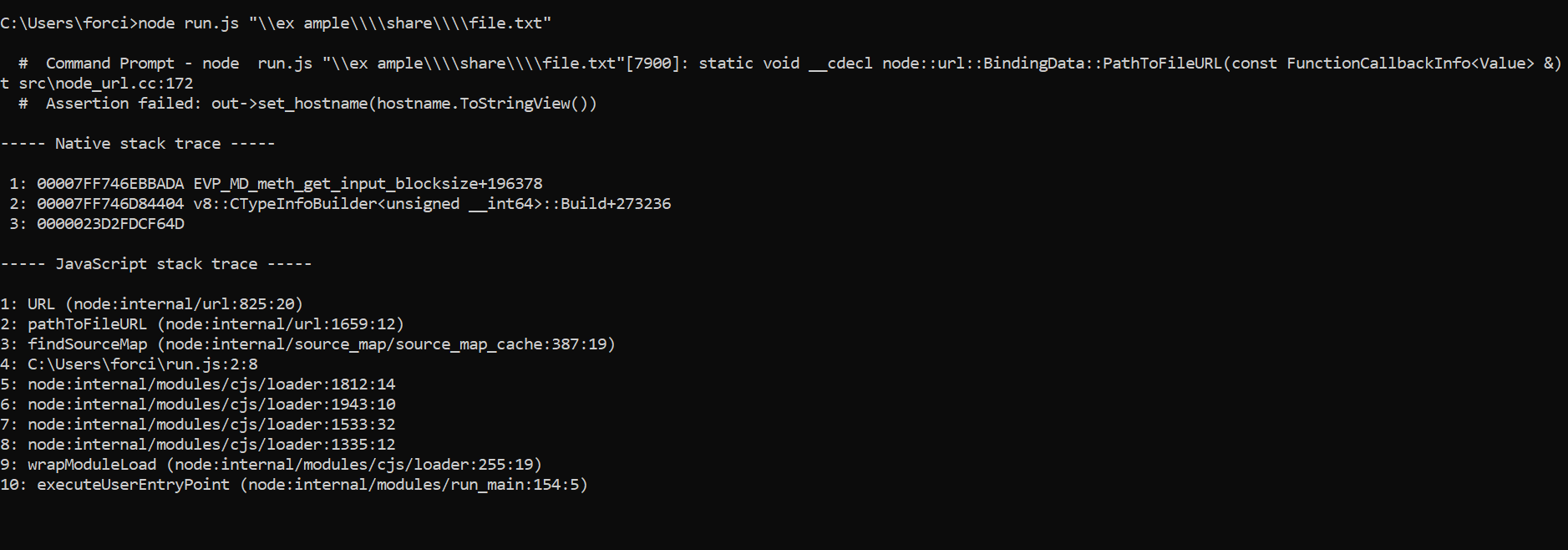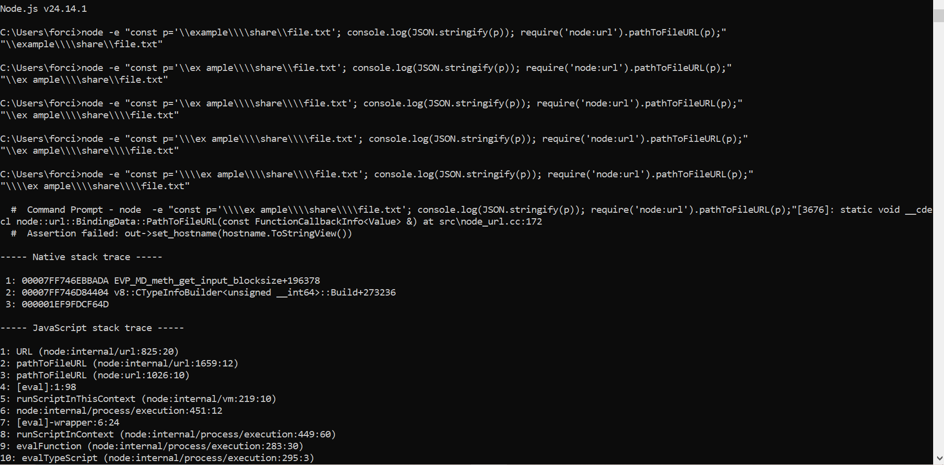 Recently while fuzzing Node.js modules I found an issue which causes the process to abort when malformed Windows UNC style paths are passed into pathToFileURL(). This was initially something I looked at as a potential security issue due to the crash behavior, but after discussion with the Node.js security / WG team it was considered a bug and tracked publicly. I ended up opening a github issue here: https://github.com/nodejs/node/issues/62546